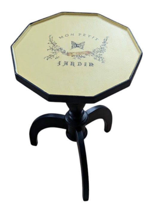 Peinture teinte abîme, cire d’or finition vitri’protect, sublimée d’un joli “transfert” doré
